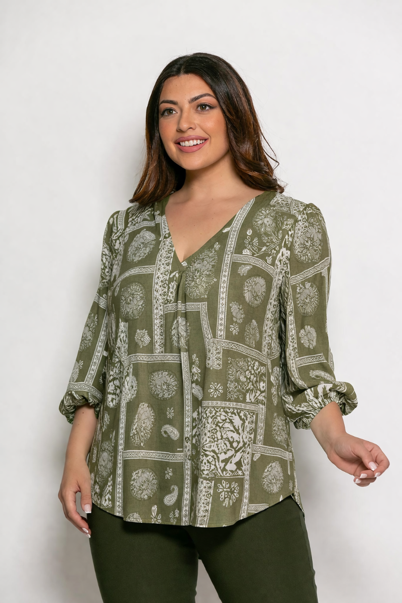 Μπλούζα Aila Με Πιέτα Στο Στήθος ! Μπλούζα σε μεγάλα μεγέθη, από εξαιρετικής ποιότητας σταθερό ύφασμα Viscose και ελληνικής κατασκευής. Φανταστική μπλούζα με V λαιμόκοψη και πιέτα στο στήθος. Έχει μακριά μανίκια και λάστιχο στο τελείωμά τους, μια μπλούζα που χαρακτηρίζεται κυρίως από άνεση και στυλ!