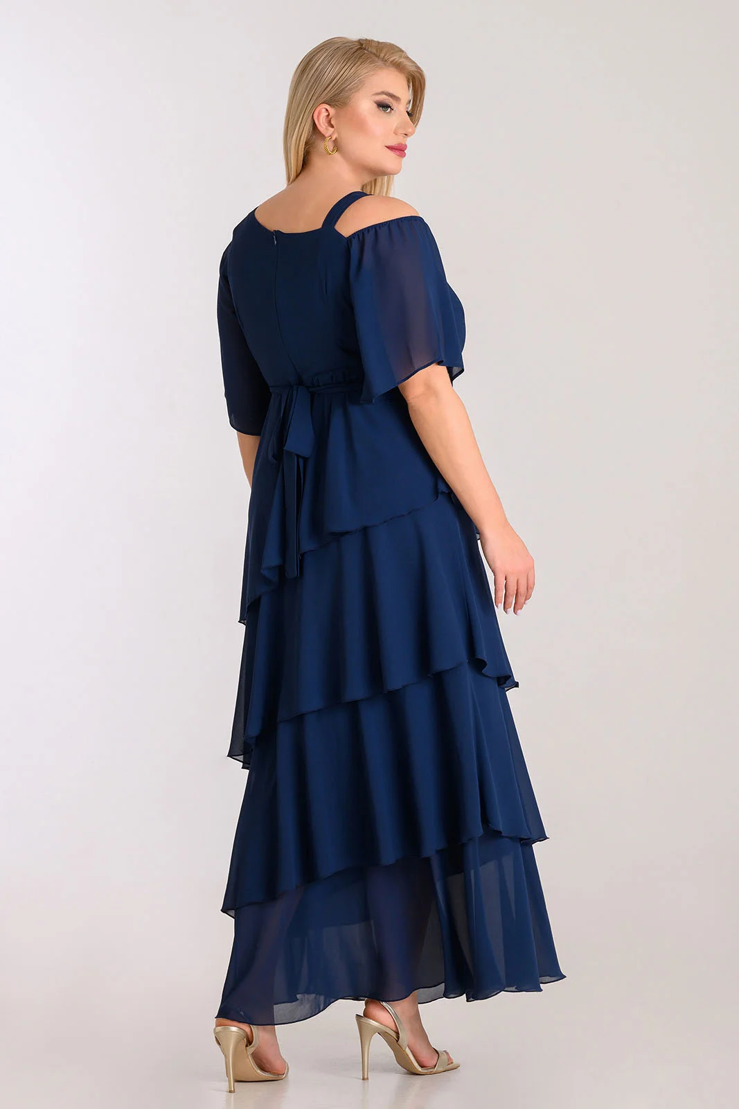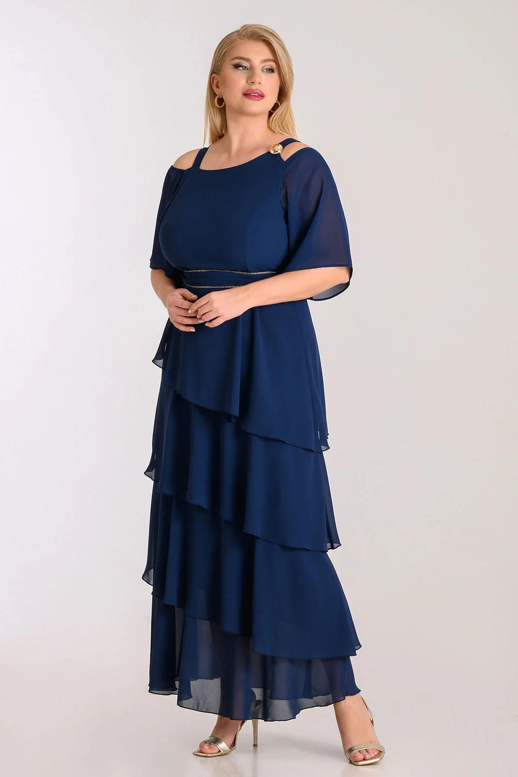 Φόρεμα από ύφασμα μουσελίνας, με διαδοχικά βολάν και ζώνη με στρας