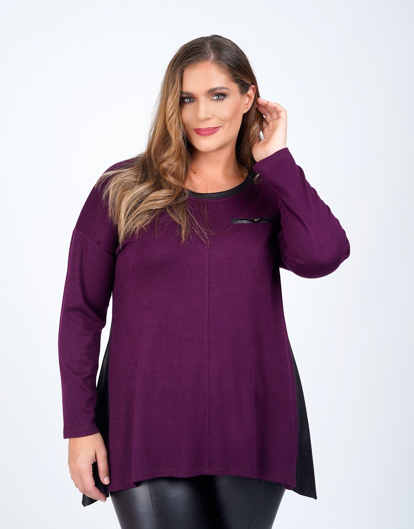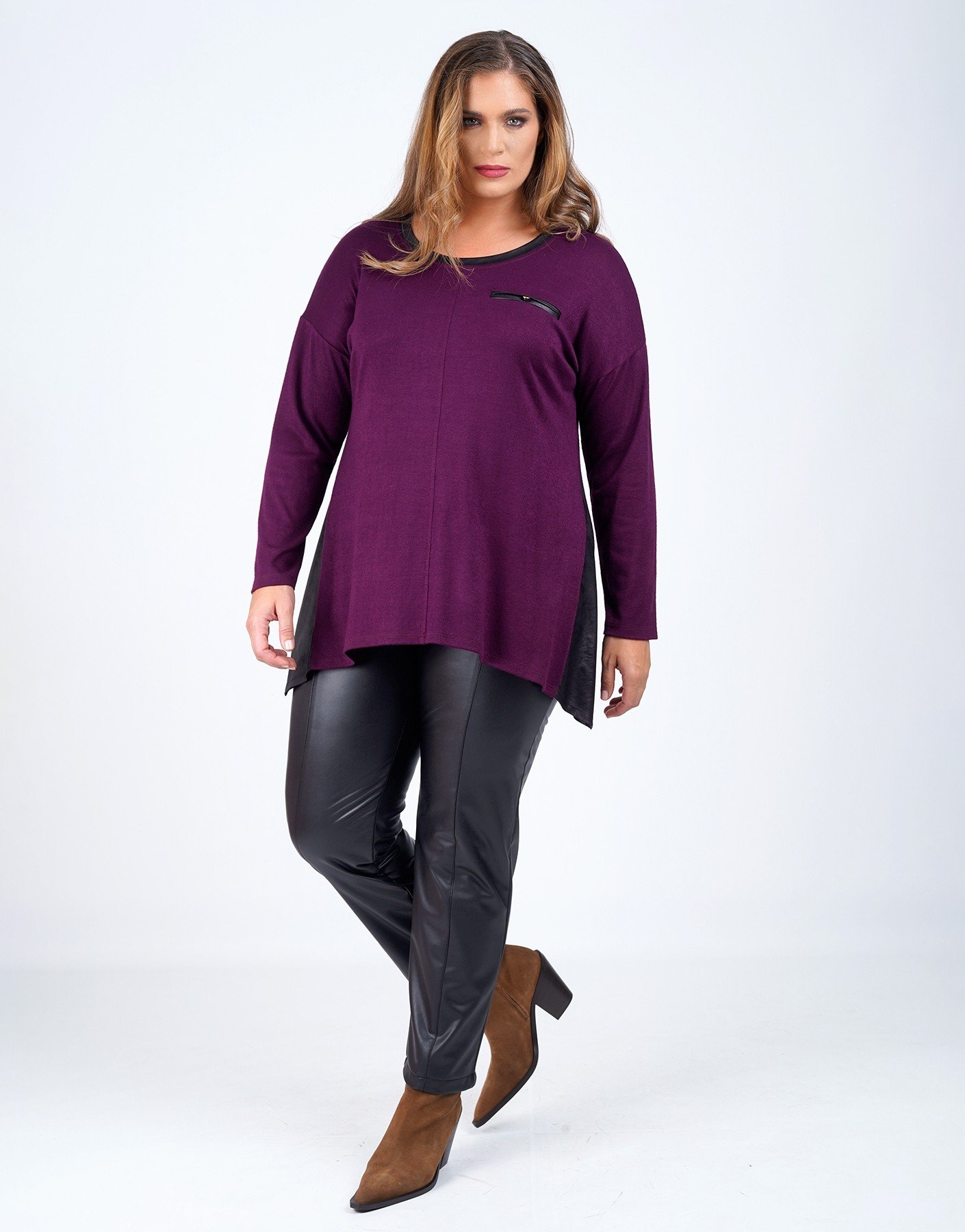 Ασύμμετρη, πλέκτη μπλούζα, μονόχρωμη με λεπτομέρειες από οικολογικό δέρμα.