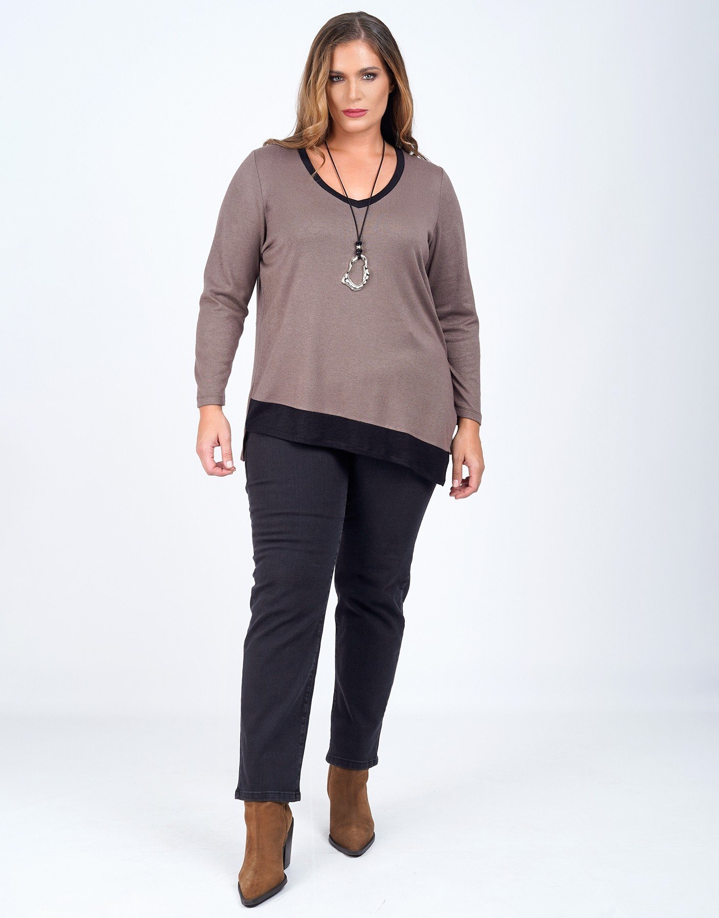 Ασύμμετρη, πλεκτή μπλούζα με διχρωμία στο τελείωμα και κολιέ.
