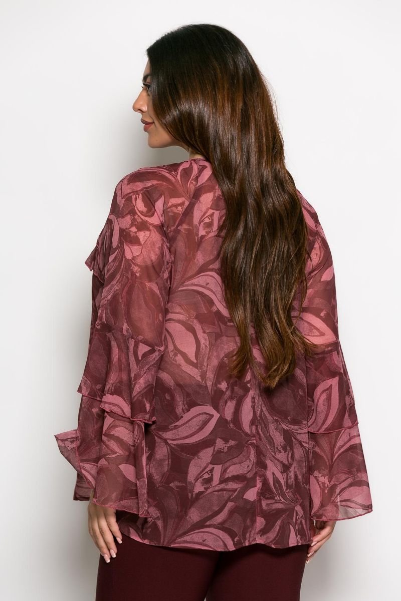 Μπλούζα Εμπριμέ Για Όλες Τις Ώρες Της Ημέρας! Μπλούζα σε μεγάλα μεγέθη, από εξαιρετικής ποιότητας σταθερό ύφασμα ζορζέτας και ελληνικής κατασκευής. Φανταστική μπλούζα με στρογγυλή λαιμόκοψη δέσιμο στο στήθος με καμπανάκια και λεπτομέρειες βολάν. Έχει μακριά μανίκια καμπάνα με βολάν στο τελείωμά τους, μια μπλούζα που χαρακτηρίζεται κυρίως από άνεση και στυλ.