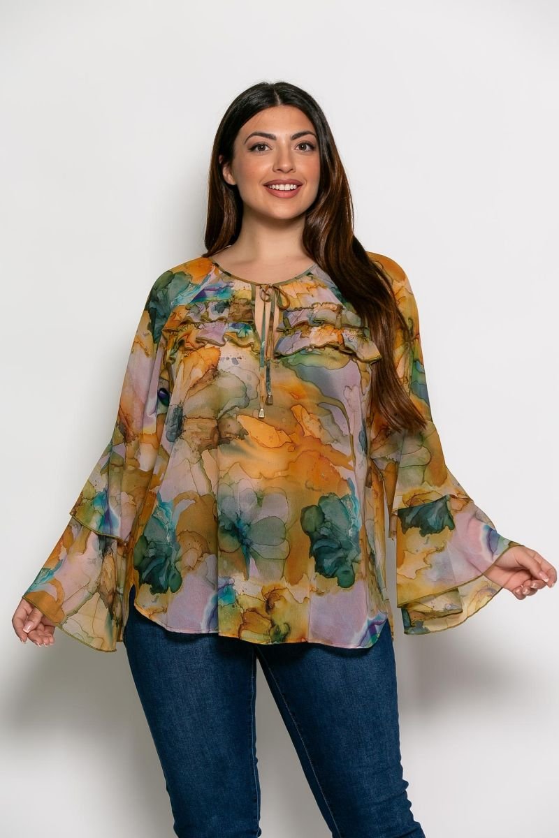 Μπλούζα Εμπριμέ Για Όλες Τις Ώρες Της Ημέρας! Μπλούζα σε μεγάλα μεγέθη, από εξαιρετικής ποιότητας σταθερό ύφασμα ζορζέτας και ελληνικής κατασκευής. Φανταστική μπλούζα με στρογγυλή λαιμόκοψη δέσιμο στο στήθος με καμπανάκια και λεπτομέρειες βολάν. Έχει μακριά μανίκια καμπάνα με βολάν στο τελείωμά τους, μια μπλούζα που χαρακτηρίζεται κυρίως από άνεση και στυλ.