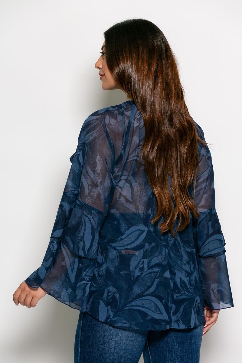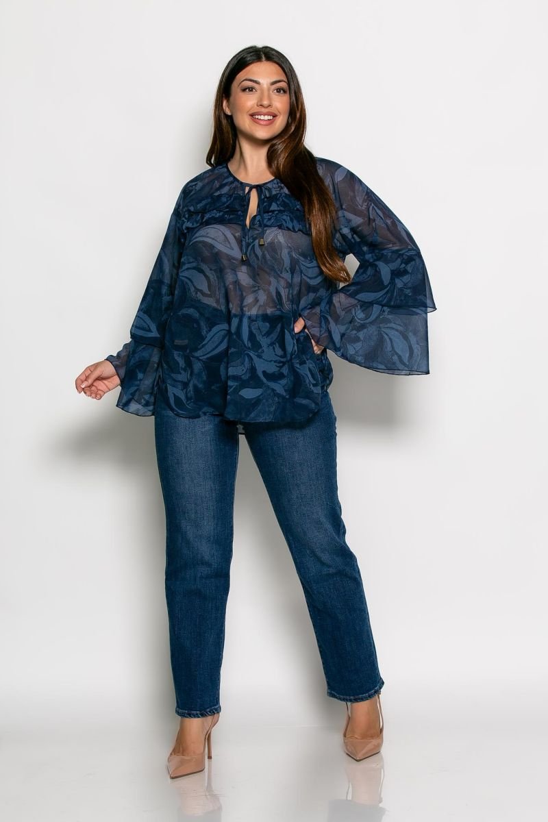 Μπλούζα Εμπριμέ Για Όλες Τις Ώρες Της Ημέρας! Μπλούζα σε μεγάλα μεγέθη, από εξαιρετικής ποιότητας σταθερό ύφασμα ζορζέτας και ελληνικής κατασκευής. Φανταστική μπλούζα με στρογγυλή λαιμόκοψη δέσιμο στο στήθος με καμπανάκια και λεπτομέρειες βολάν. Έχει μακριά μανίκια καμπάνα με βολάν στο τελείωμά τους, μια μπλούζα που χαρακτηρίζεται κυρίως από άνεση και στυλ.