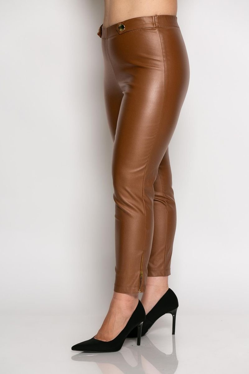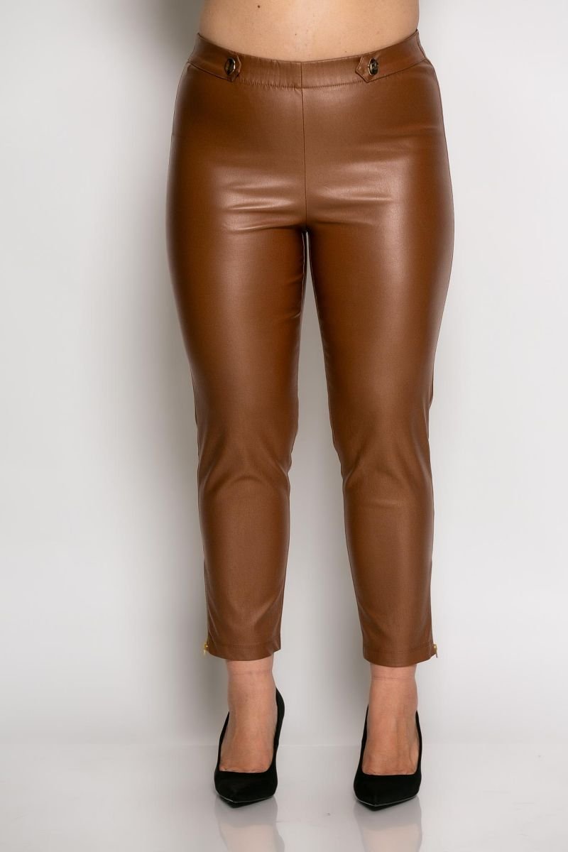 Παντελόνι από εξαιρετικής ποιότητας ύφασμα με μικρή ελαστικότητα δερματίνη και ελληνικής κατασκευής. Παντελόνι σε ίσια γραμμή για όλες τις ώρες της ημέρας. Στην μέση έχει λάστιχο και διακοσμητικά κουμπιά και στο τελείωμα στο κάτω μέρος έχει φερμουάρ το οποίο ανοίγει.. Ένα πολύ ελαστικό παντελόνι που χαρακτηρίζεται κυρίως από άνεση και στυλ.