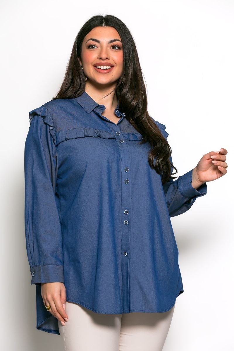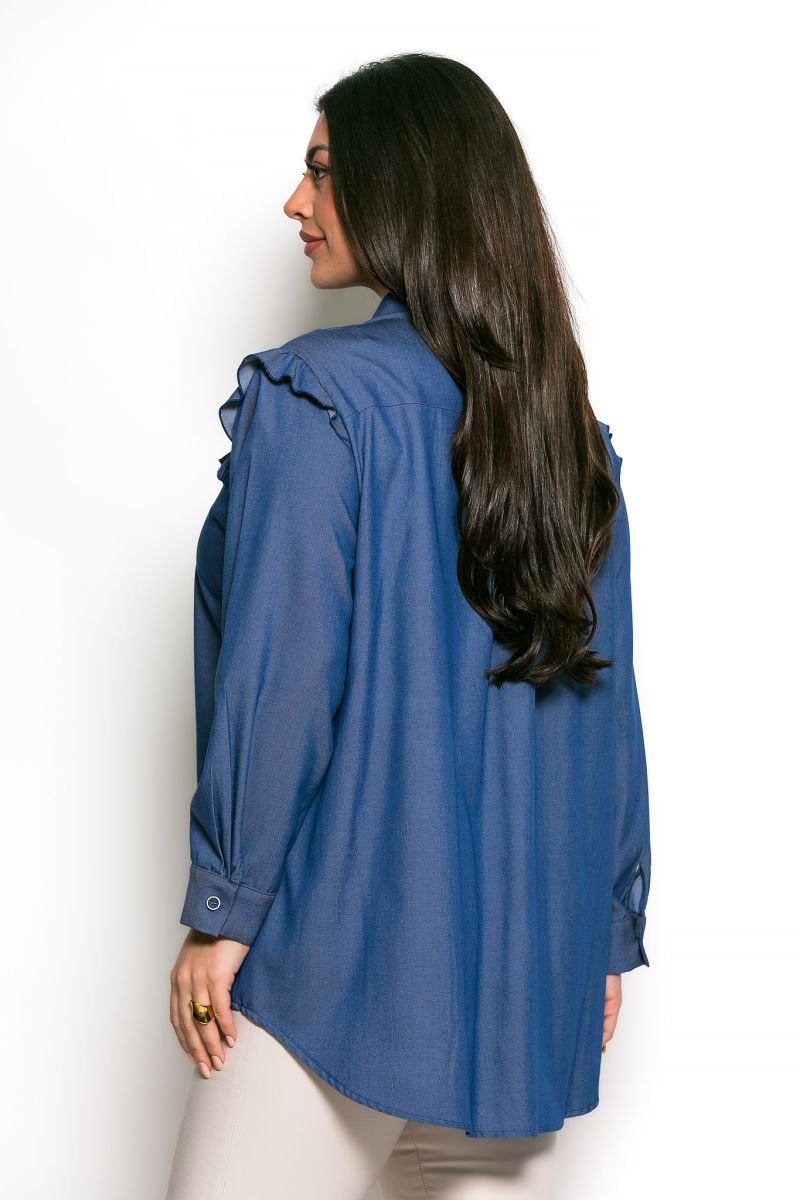 Πουκαμίσα με λεπτομέρειες βολάν! Μπλούζα από εξαιρετικής ποιότητας ύφασμα και ελληνικής κατασκευής. Έχει μακριά μανίκια με κουμπί στο τελείωμά τους. Έχει φαρδιά γραμμή και κλασικό γιακά. Στους ώμους και στο στήθος έχει λεπτομέρειες βολάν. Το ύφασμά του είναι σταθερό και είναι ένα κομμάτι που δεν πρέπει να λείπει από καμία γκαρνταρόμπα!